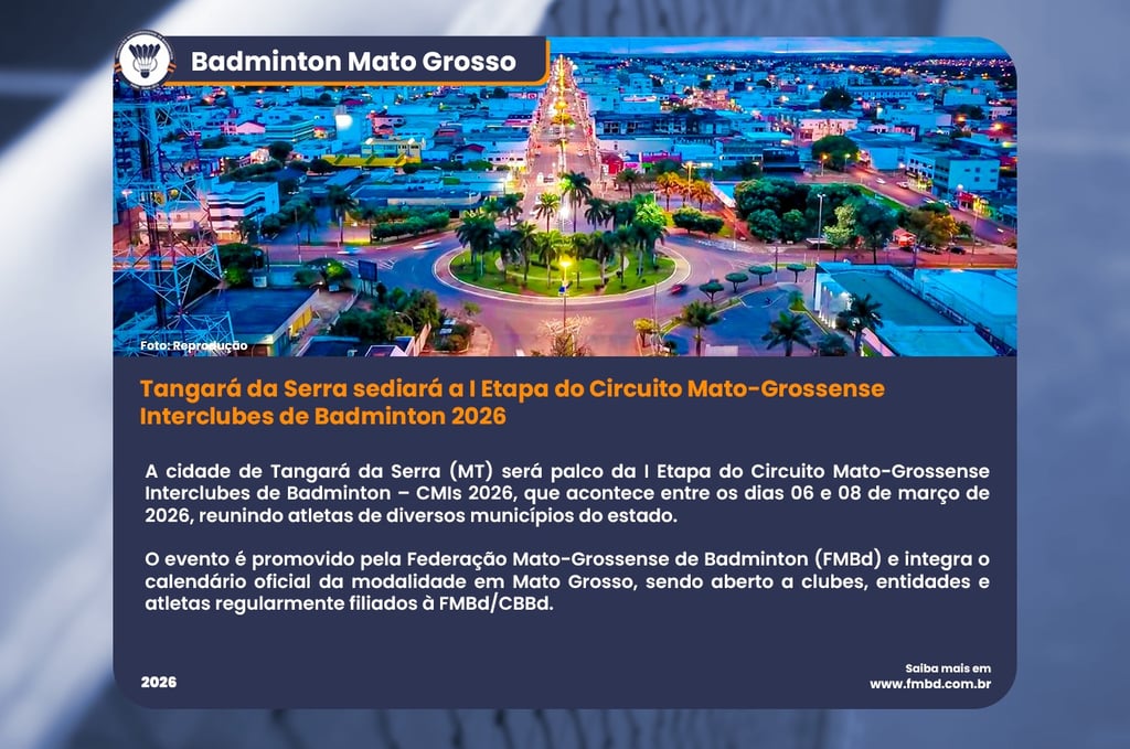 A cidade de Tangará da Serra (MT) será palco da I Etapa do Circuito Mato-Grossense Interclubes de Badminton – CMIs 2026, que acontece entre os dias 06 e 08 de março de 2026, reunindo atletas de diversos municípios do estado. O evento é promovido pela Federação Mato-Grossense de Badminton (FMBd) e integra o calendário oficial da modalidade em Mato Grosso, sendo aberto a clubes, entidades e atletas regularmente filiados à FMBd/CBBd.