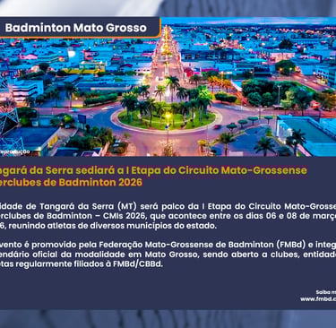 A cidade de Tangará da Serra (MT) será palco da I Etapa do Circuito Mato-Grossense Interclubes de Badminton – CMIs 2026, que acontece entre os dias 06 e 08 de março de 2026, reunindo atletas de diversos municípios do estado.